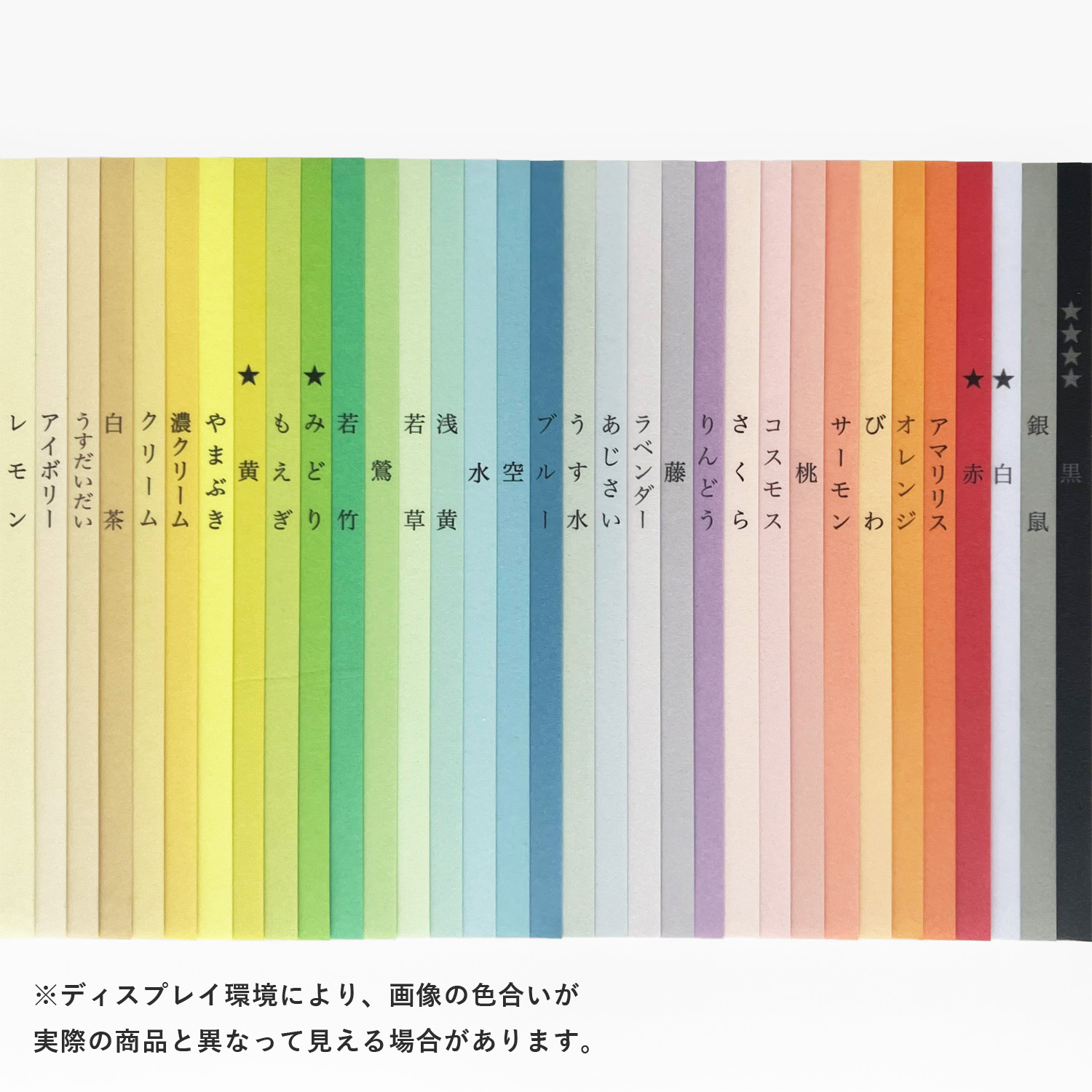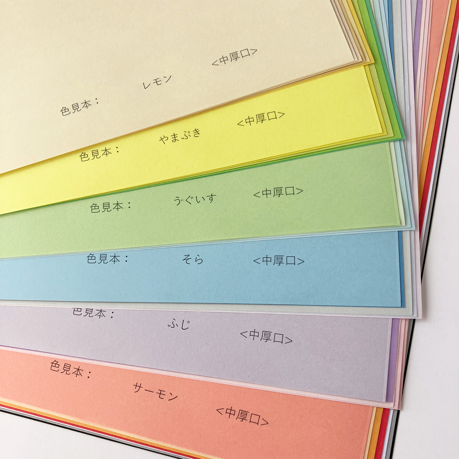 ※こちらは〈中厚口〉の厚みで、すべての色を確認できる、紀州の色上質紙の全色サンプルセットです。