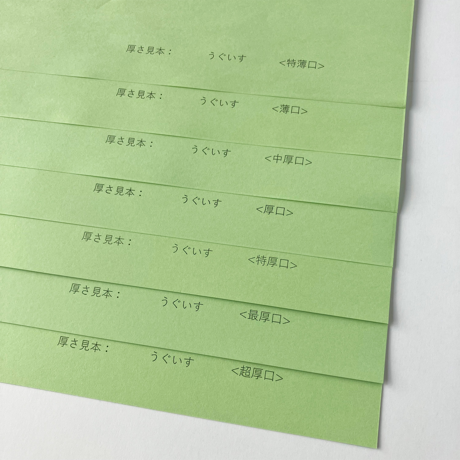 ※こちらは、色が〈ウグイス〉のみで、全ての厚みを確認できる、紀州の色上質紙の全厚みサンプルセットです(色名・厚み記入あり)